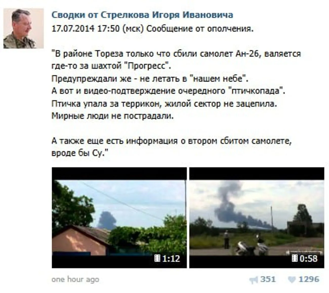 Later, after it turned out to be an international passenger airliner, the "DPR" abruptly refused to take responsibility for the tragedy. However, the video of the Boeing-777 crash on the Russian TV channel LifeNews was initially presented as a video of the "fall of a Ukrainian An-26 shot down by the militia," as Girkin wrote.