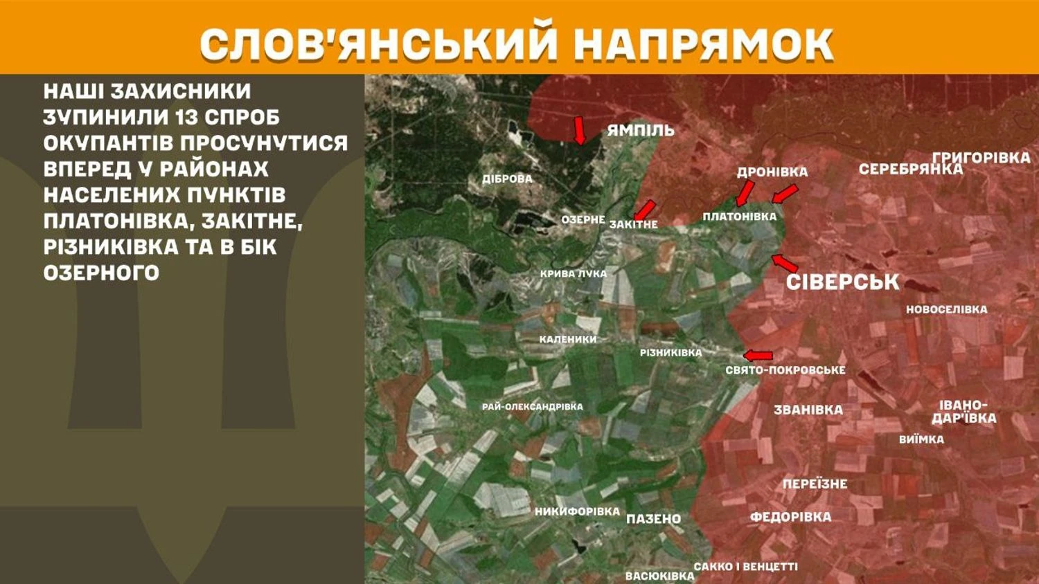 In the Sloviansk direction, during yesterday, Ukrainian defenders stopped 13 attempts by the occupiers to advance in the areas of Platonivka, Zakitne, Riznykivka, and towards Ozerne.