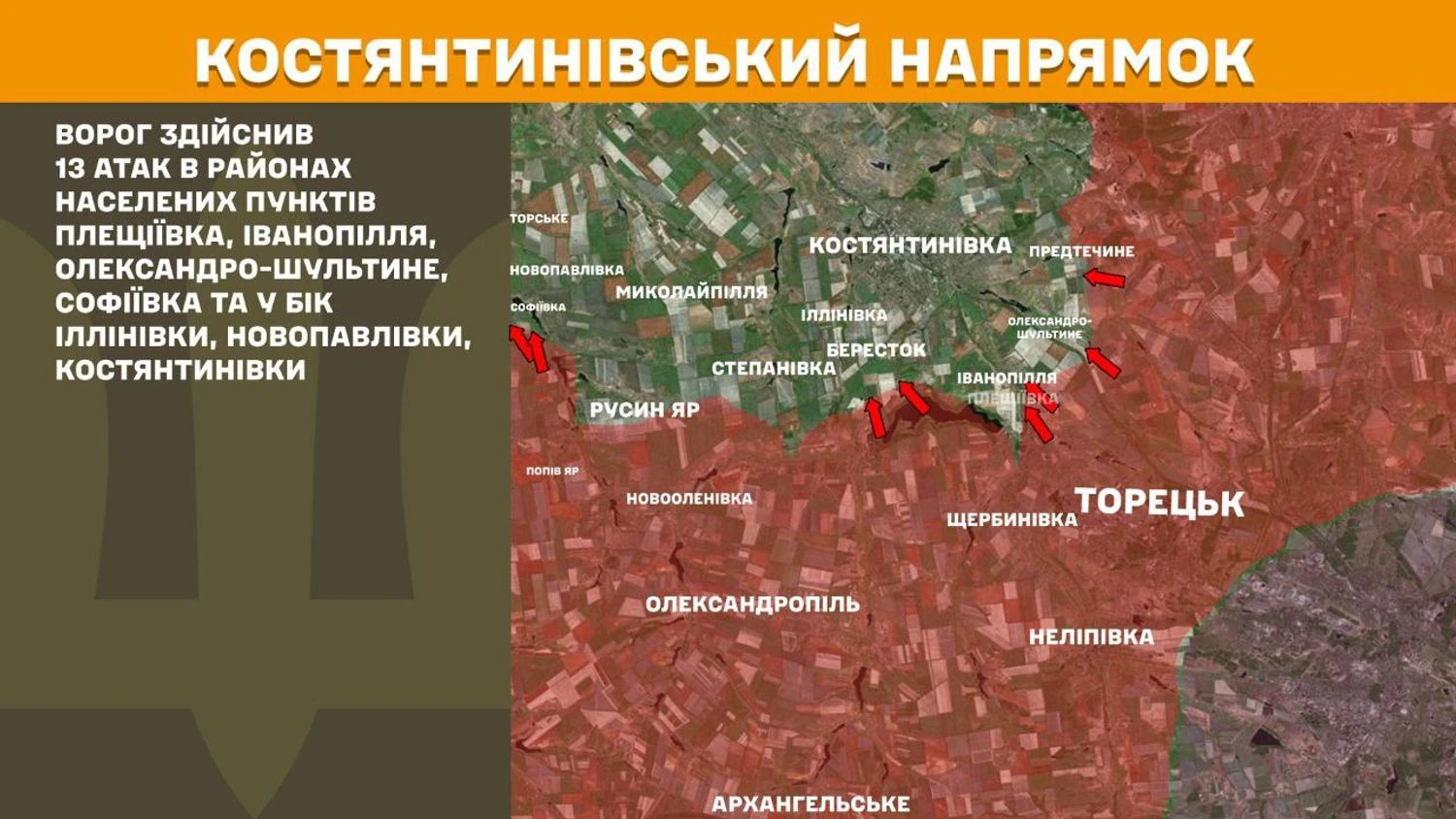 In the Kostiantynivka direction, the enemy carried out 13 attacks in the areas of Pleshchiivka, Ivanopillia, Oleksandro-Shultyne, Sofiivka, and towards Illinivka, Novopavlivka, Kostiantynivka.