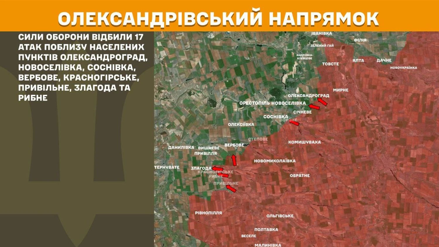 In the Oleksandrivka direction, the Defense Forces repelled 17 attacks near the settlements of Oleksandrograf, Novoselivka, Sosnivka, Verbove, Krasnohirske, Pryvilne, Zlahoda, and Rybne.