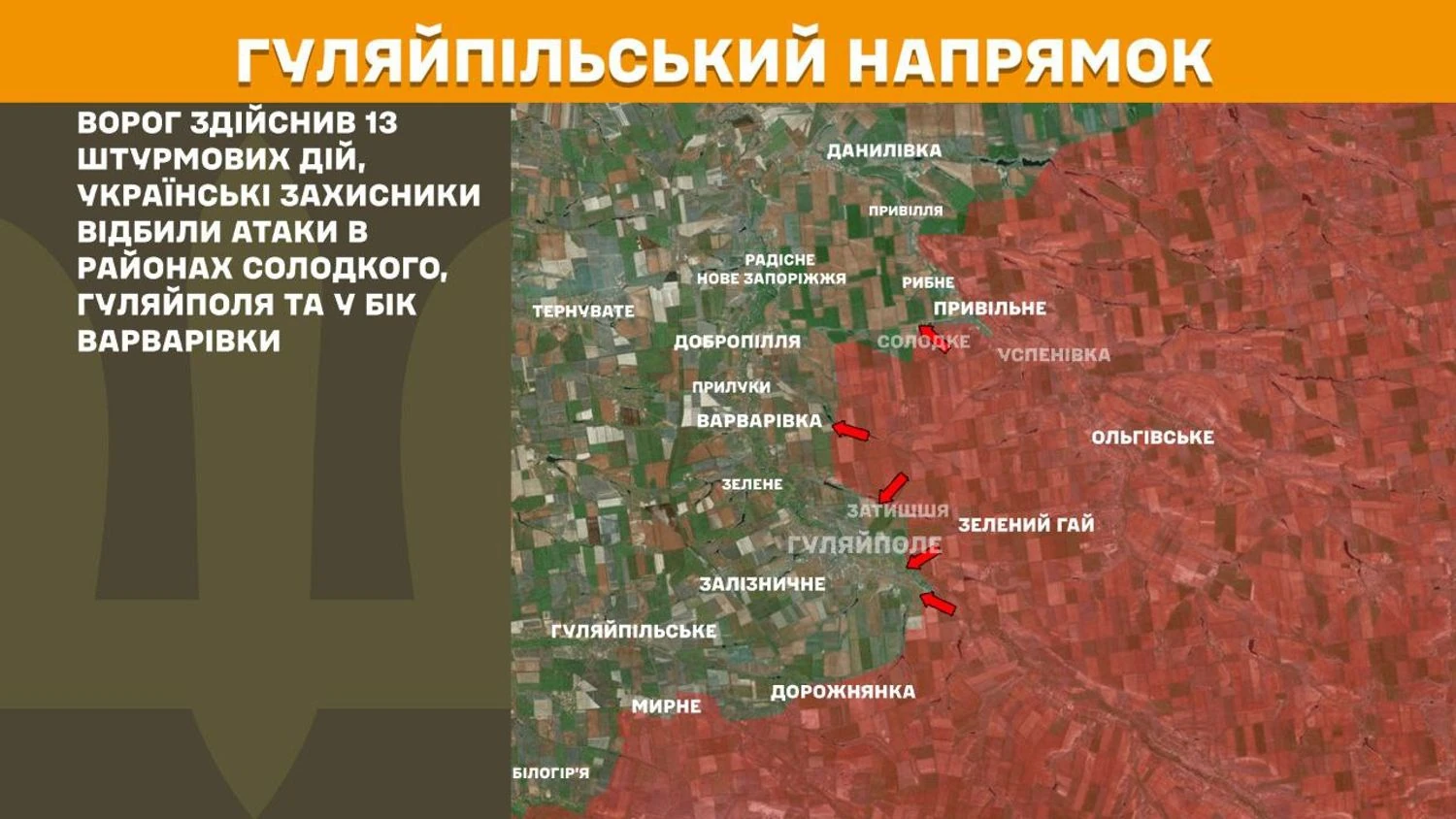 In the Huliaipole direction, the enemy carried out 13 assault actions, Ukrainian defenders repelled attacks in the areas of Solodke, Huliaipole, and towards Varvarivka.