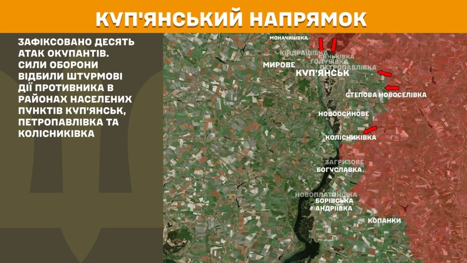 In the Kupiansk direction, ten enemy attacks were recorded. The Defense Forces repelled enemy assault actions in the areas of Kupiansk, Petropavlivka, and Kolisnykivka.