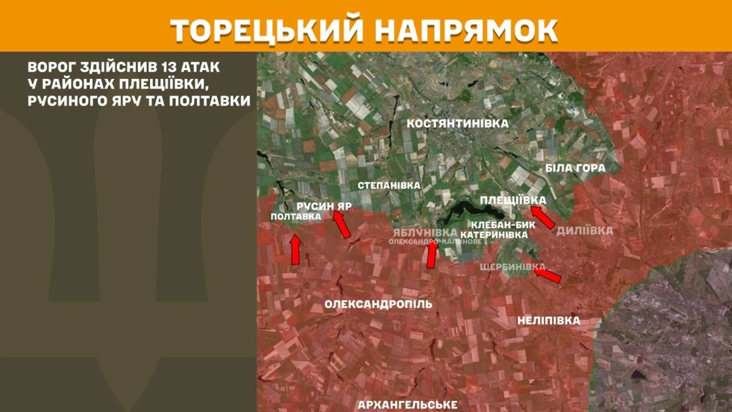 In the Toretsk direction, the enemy carried out 13 attacks in the areas of Pleshchiivka, Rusyn Yar, and Poltavka.