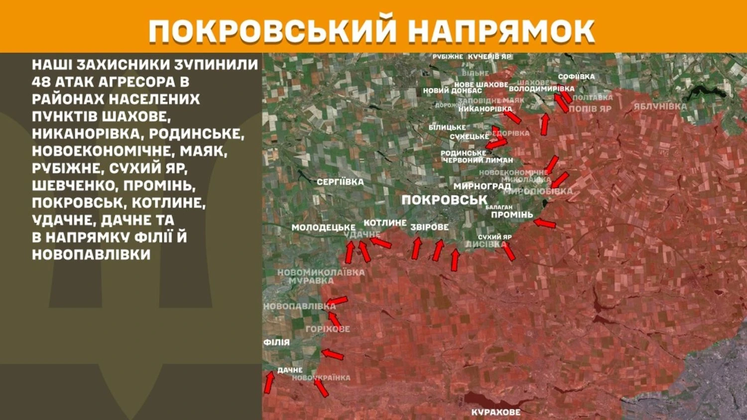In the Pokrovsk direction, our defenders stopped 48 aggressor attacks in the areas of Shakhtove, Nykanorivka, Rodynske, Novoekonomichne, Mayak, Rubizhne, Sukhyi Yar, Shevchenko, Promin, Pokrovsk, Kotlyne, Udachne, Dachne, and in the direction of Filiia and Novopavlivka.