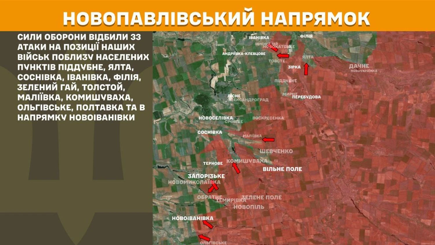 In the Novopavlivka direction, the Defense Forces repelled 33 attacks on positions near the settlements of Piddubne, Yalta, Sosnivka, Ivanivka, Filiia, Zelenyi Hai, Tolstoy, Maliivka, Kamyshivakha, Olhivske, Poltavka and in the direction of Novoivanivka.