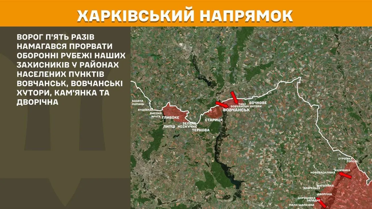 In the Kharkiv direction, the enemy tried five times to break through the defensive lines of our defenders in the areas of the settlements of Vovchansk, Vovchanski Khutory, Kamyanka and Dvorichna.