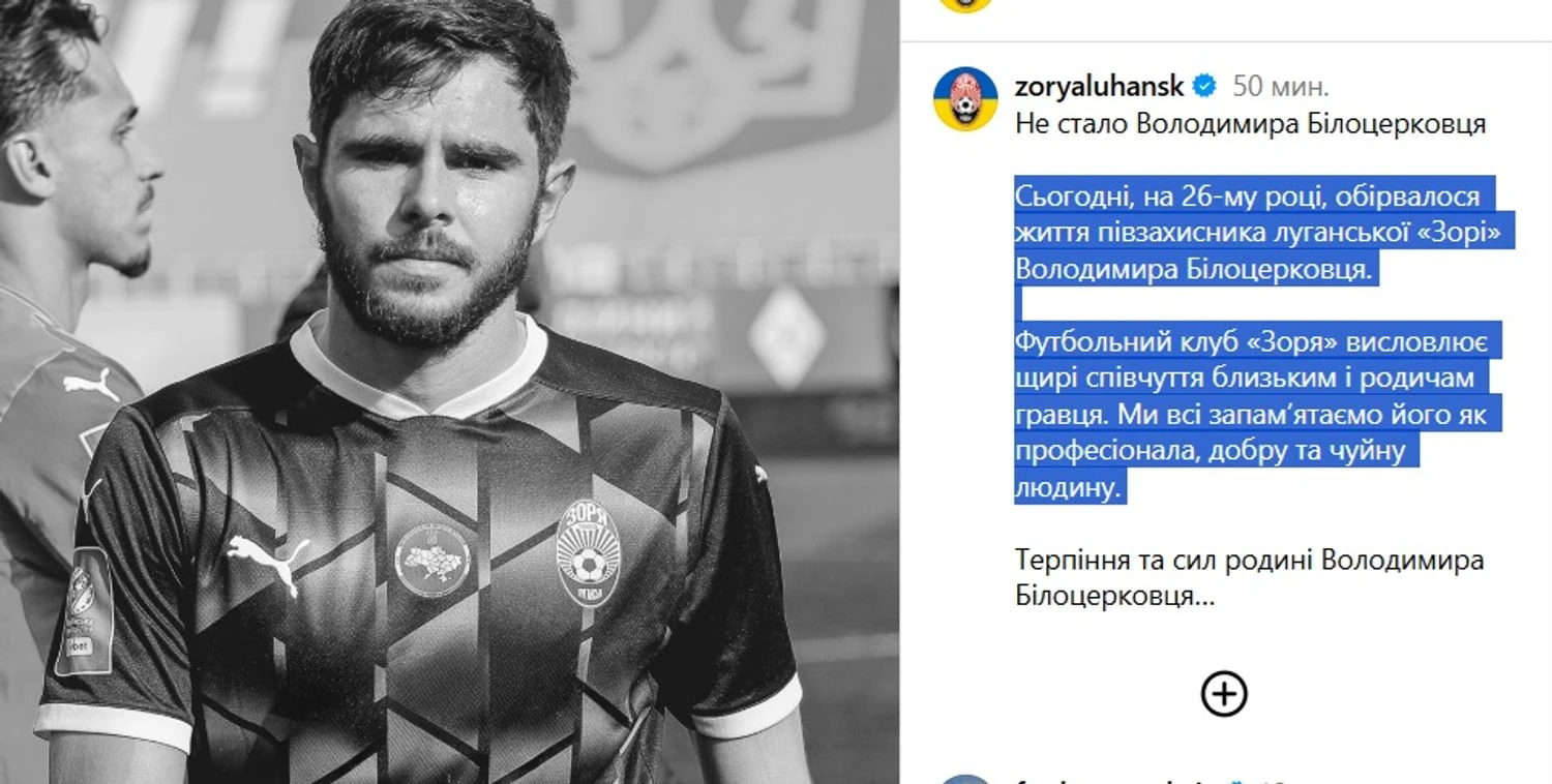 Today, at the age of 26, the life of Luhansk "Zorya" midfielder Volodymyr Bilotserkovets was cut short. Football club "Zorya" expresses sincere condolences to the player's loved ones and relatives. We will all remember him as a professional, a kind and sympathetic person.