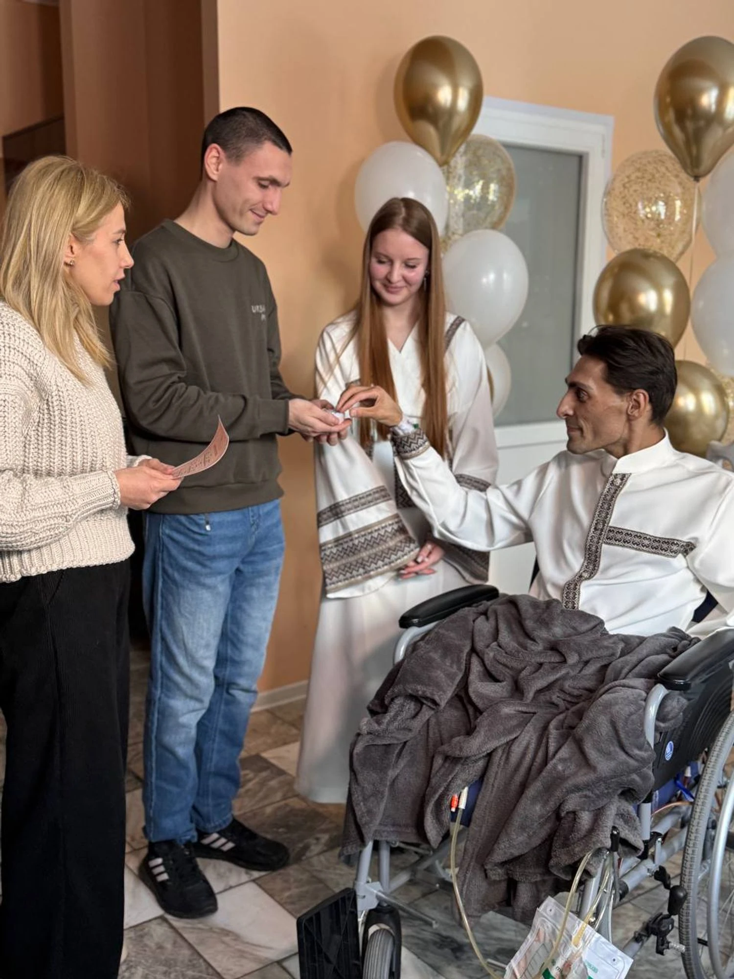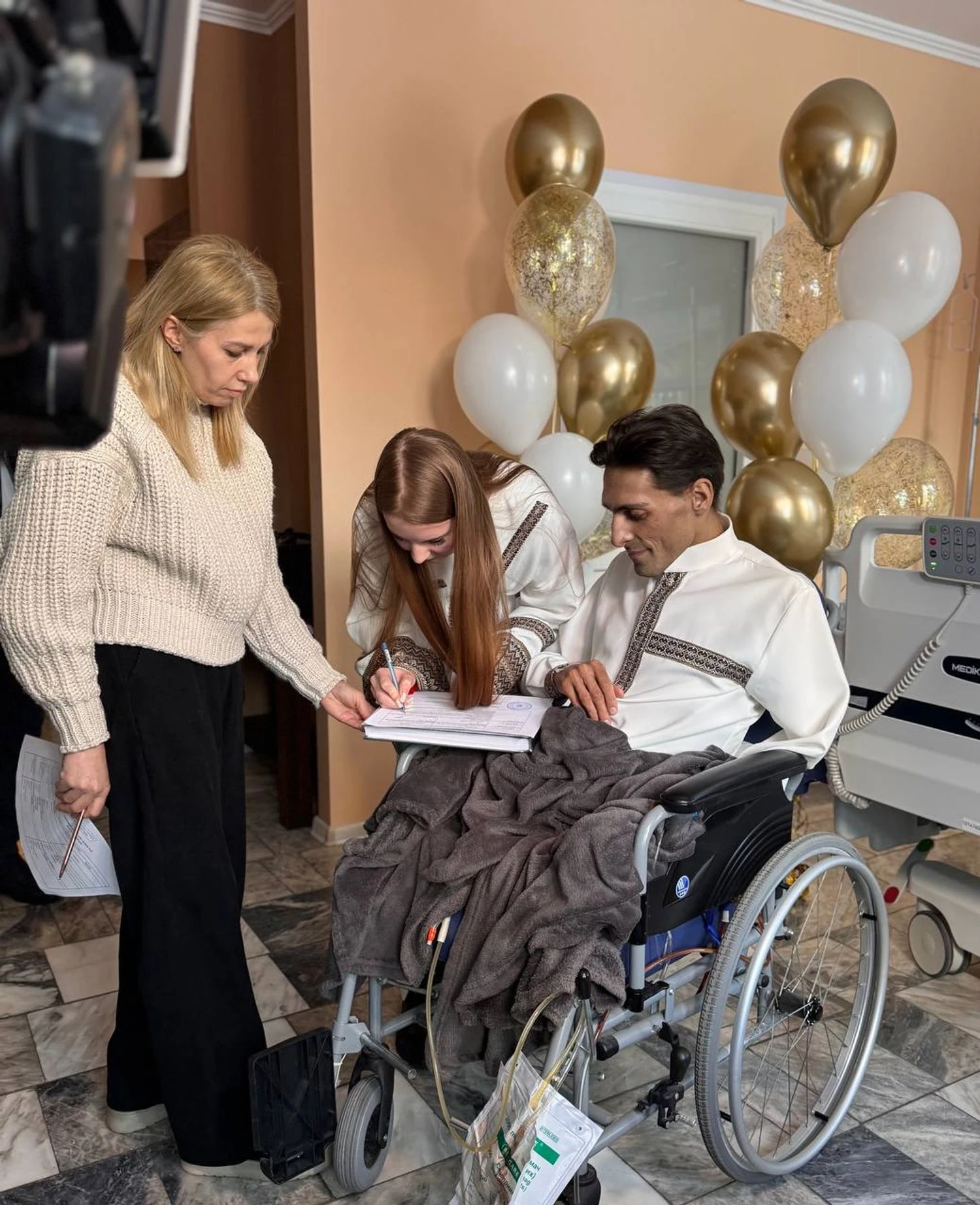 At the O.O. Shalimov National Scientific Center for Surgery and Transplantology, severely wounded soldier Denys married Milena. They met in Kramatorsk, and Denys sustained a mine-blast injury, which resulted in the amputation of his legs and arm.