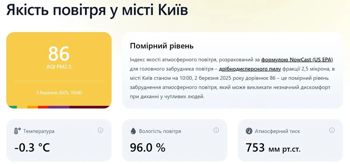 As of the morning of March 2, the air quality index exceeded the level of 80, according to the NowCast formula (US EPA). This means that the level of air pollution is moderate.