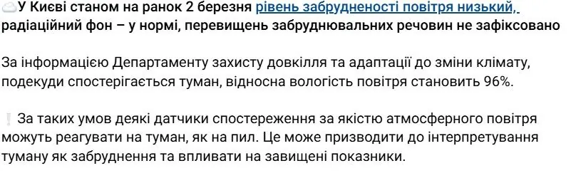 The Kyiv city administration also reported that as of the morning of March 2, the level of air pollution in the capital was low. The radiation background is normal, and no exceedances of pollutants have been recorded, according to the KCSA website.