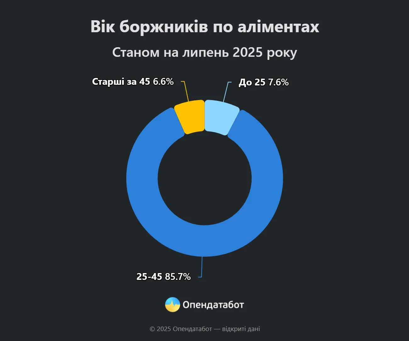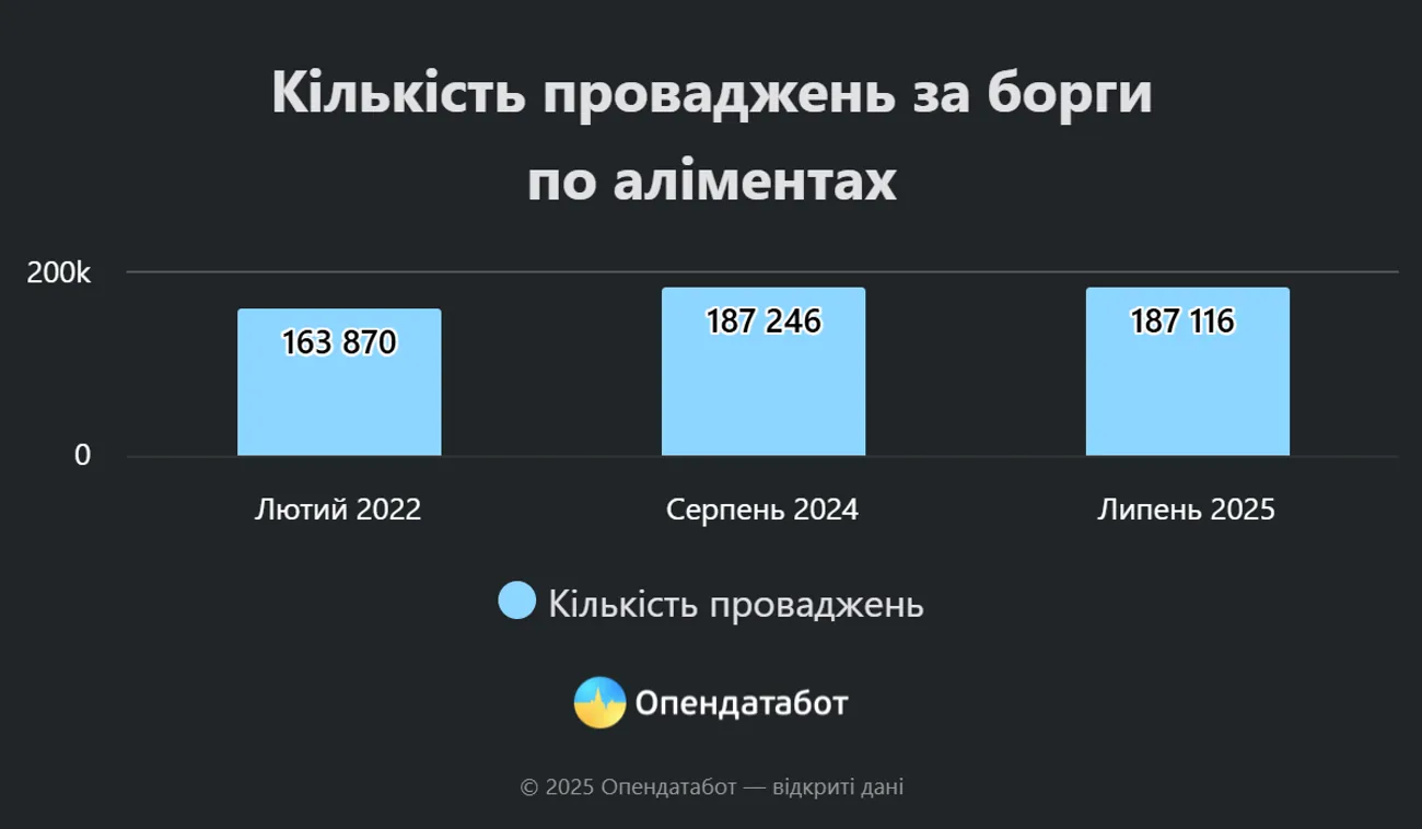 As of mid-July 2025, over 187,000 proceedings for non-payment of alimony have been recorded in the Unified Register of Debtors. The number of proceedings has increased by 23,000 since the start of the full-scale invasion, with 91% of them opened against men.