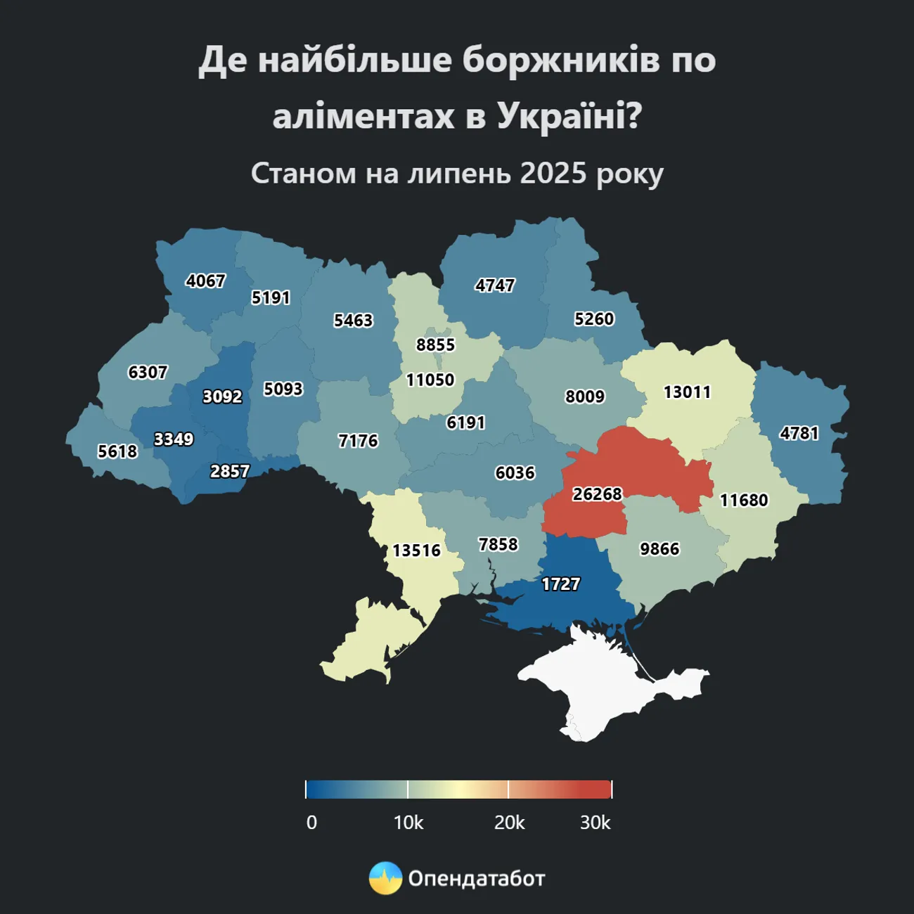 The largest number of proceedings due to non-payment of alimony were opened in Dnipropetrovsk region - 26,268. This is followed by Odesa (13,516), Kharkiv (13,011), Donetsk (11,680) and Kyiv (11,050) regions. Overall, an increase was recorded in 19 regions, and a decrease in six