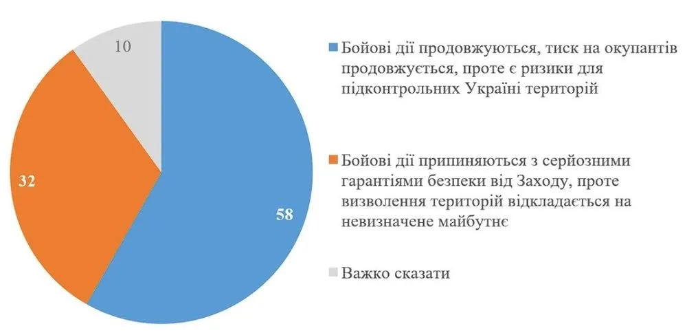 The poll shows that 58% of Ukrainians favor continuing military action against Russia, even with reduced Western aid, while 32% would prefer to end it if serious security guarantees are provided. Regional opinions vary, with greater support for continuation in western and central Ukraine.