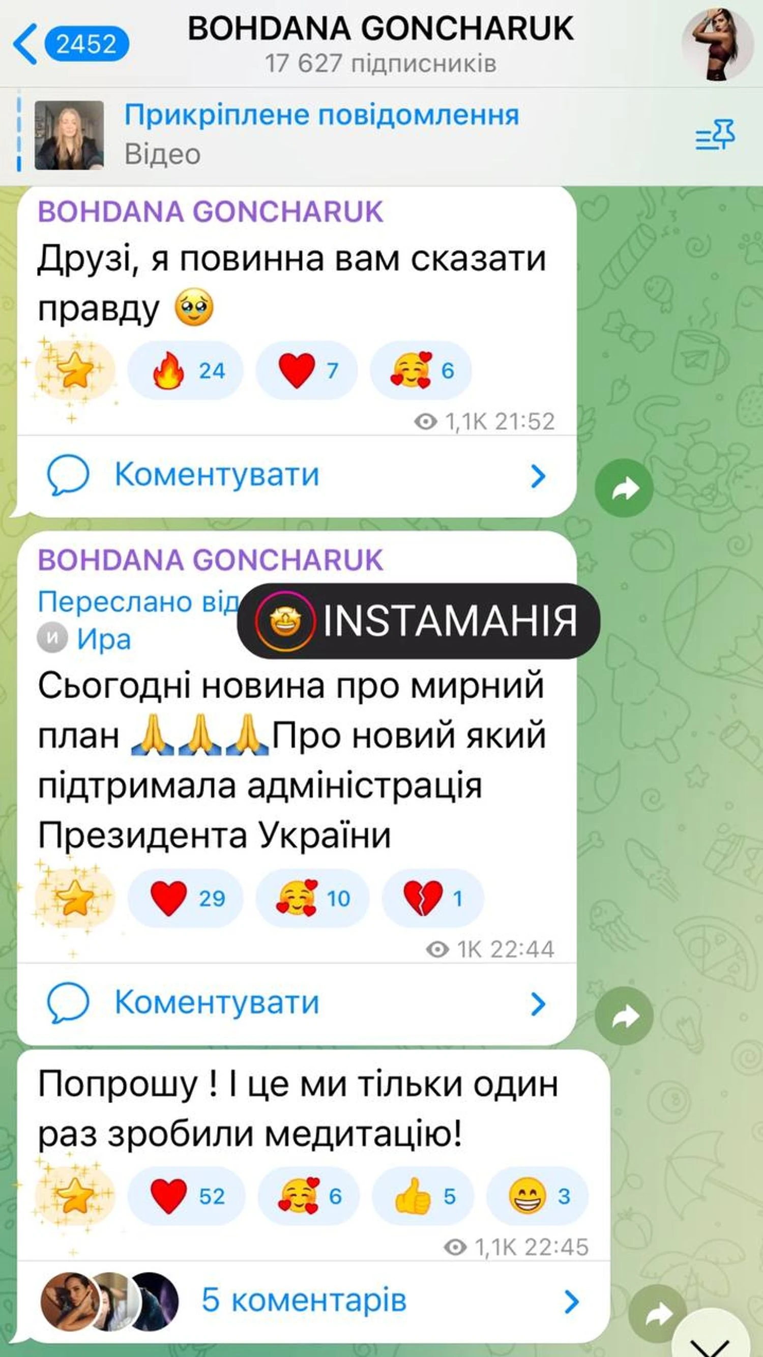 Ukrainian blogger Bohdana Honcharuk jokingly told her subscribers that her meditations allegedly contributed to the formation of a peace plan adopted by the presidential administration. She wrote about this in her blog, UNN reports.