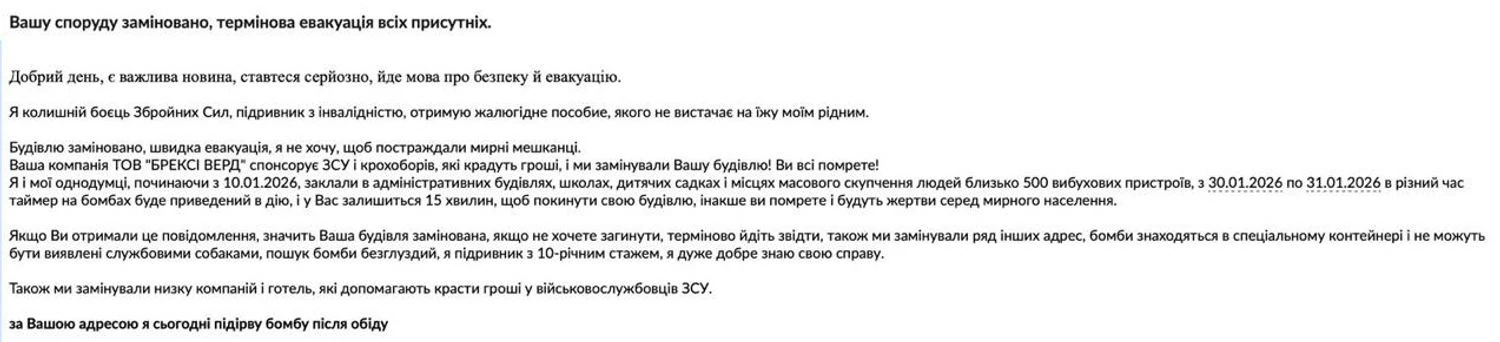 I and my like-minded people, starting from 10.01.2026, have planted about 500 explosive devices in administrative buildings, schools, kindergartens, and places of mass gathering of people. From 30.01.2026 to 31.01.2026, at different times, the timer on the bombs will be activated, and you will have 15 minutes to leave your building, otherwise you will die and there will be casualties among the civilian population.