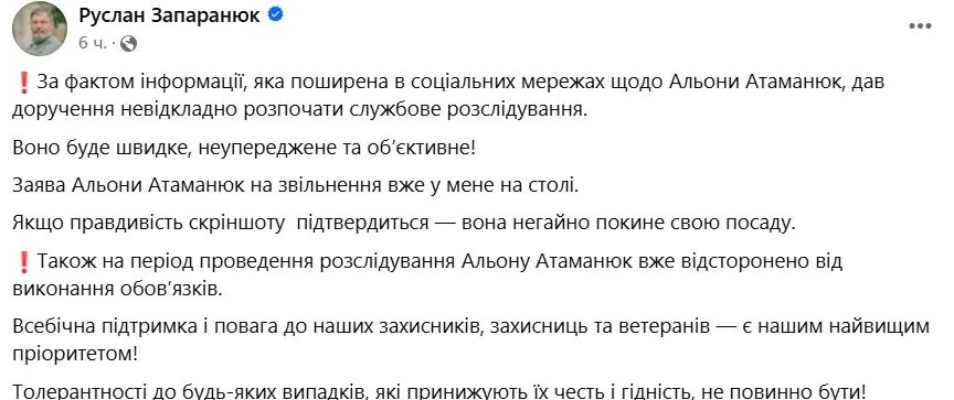 On February 27, the head of the regional administration, Ruslan Zaparaniuk, posted a message on his Facebook page stating that an internal investigation had been initiated against Atamaniuk.
