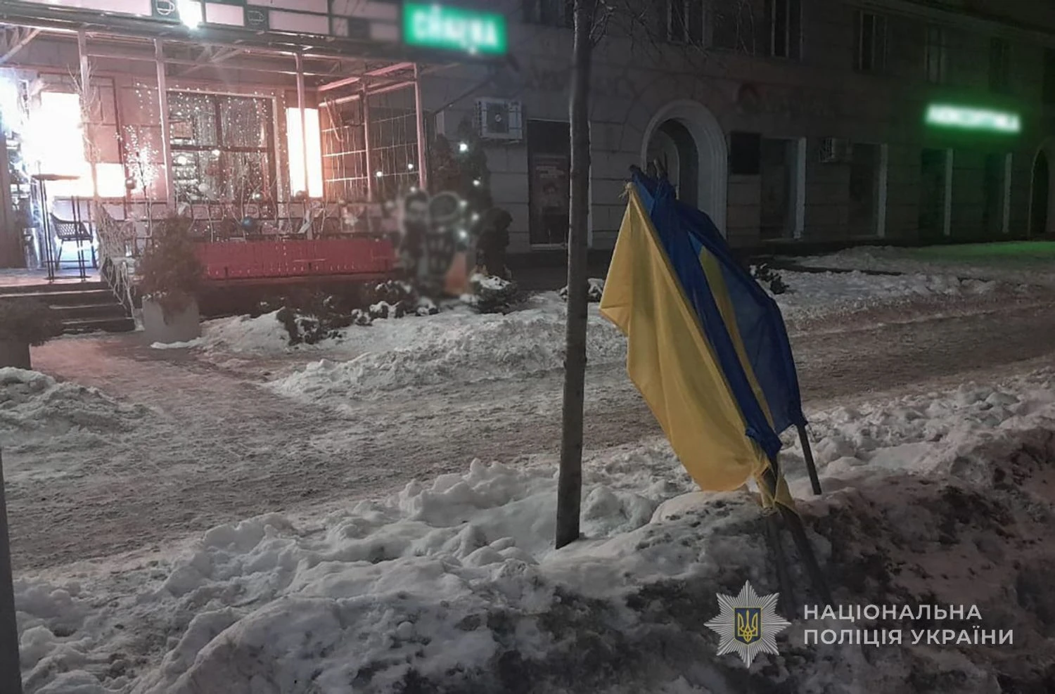 According to law enforcement officers, on January 22 at 8:41 PM, an unknown man near the roadway broke the fastenings of blue and yellow flags and threw them on the roadside. This happened at the intersection of Metalurhiv Avenue and Sobornyi Avenue.