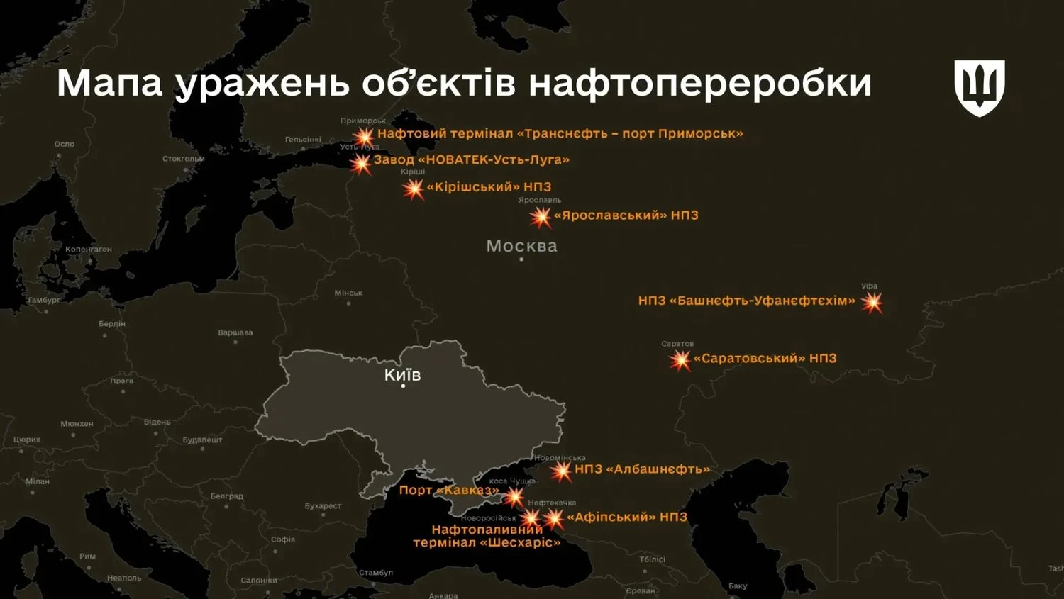 In addition, 10 oil industry facilities were hit: Russian oil refineries, terminals, and ports. Among them are "Albashneft" and "Afipsky" oil refineries, "Caucasus" Port and "Shesharis" oil and fuel terminal (Novorossiysk), "Saratovsky" oil refinery and "Bashneft-Ufaneftekhim", "Kirishsky" and "Yaroslavsky" oil refineries, "Transneft - Port Primorsk" and "NOVATEK-Ust-Luga" terminals.