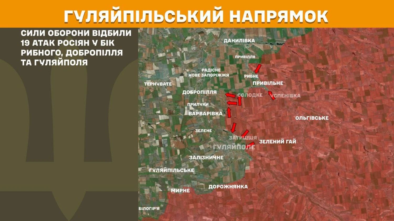 In the Huliaipole direction, the Defense Forces repelled 19 Russian attacks towards Rybne, Dobropillia, and Huliaipole.