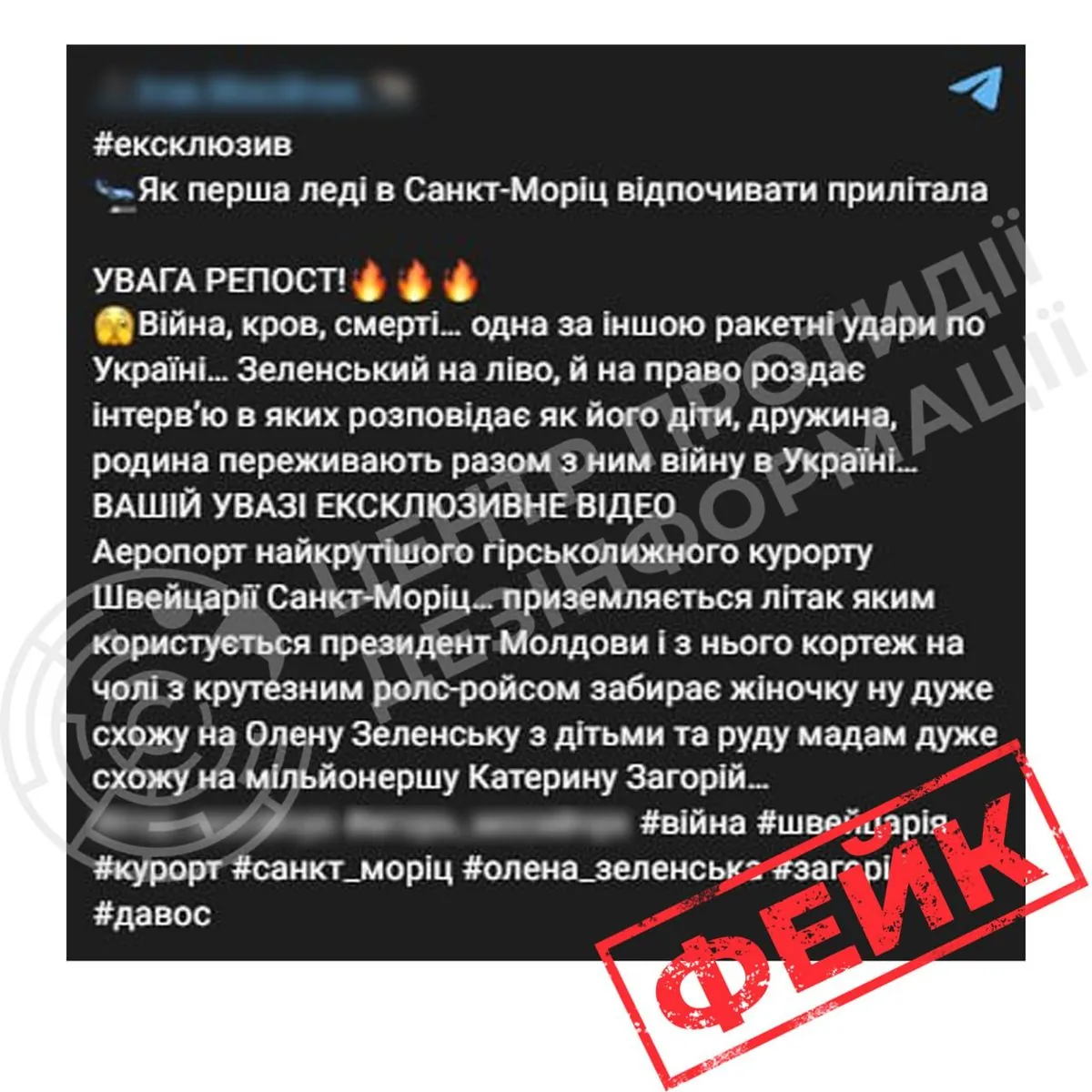 A fake video is circulating online claiming that First Lady of Ukraine Olena Zelenska is allegedly vacationing in the ski resort of St. Moritz. It was reported by the Center for Countering Disinformation , UNNand UNN .