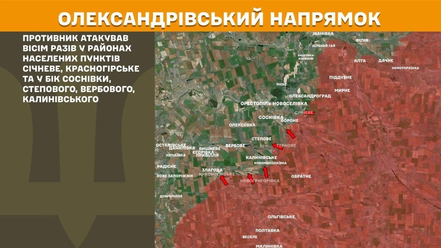 In the Oleksandrivka direction, the enemy attacked eight times in the areas of Sichneve, Krasnohirske, and towards Sosnivka, Stepove, Verbove, Kalynivske.