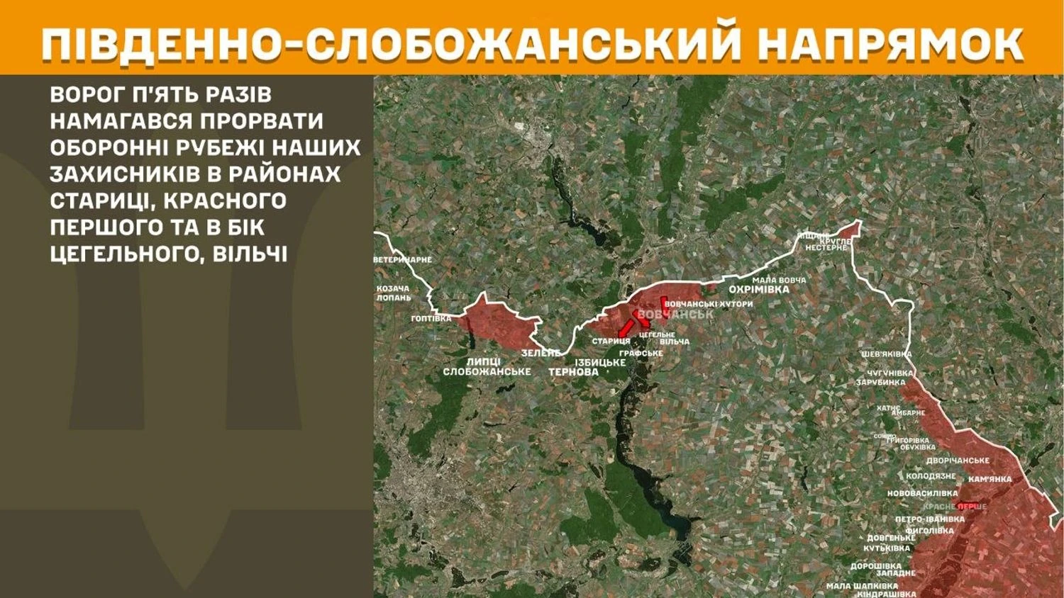 In the Southern Slobozhansky direction, the enemy tried to break through the defensive lines of our defenders five times in the areas of Starytsia, Krasne Pershe, and towards Tsehelne, Vilcha.