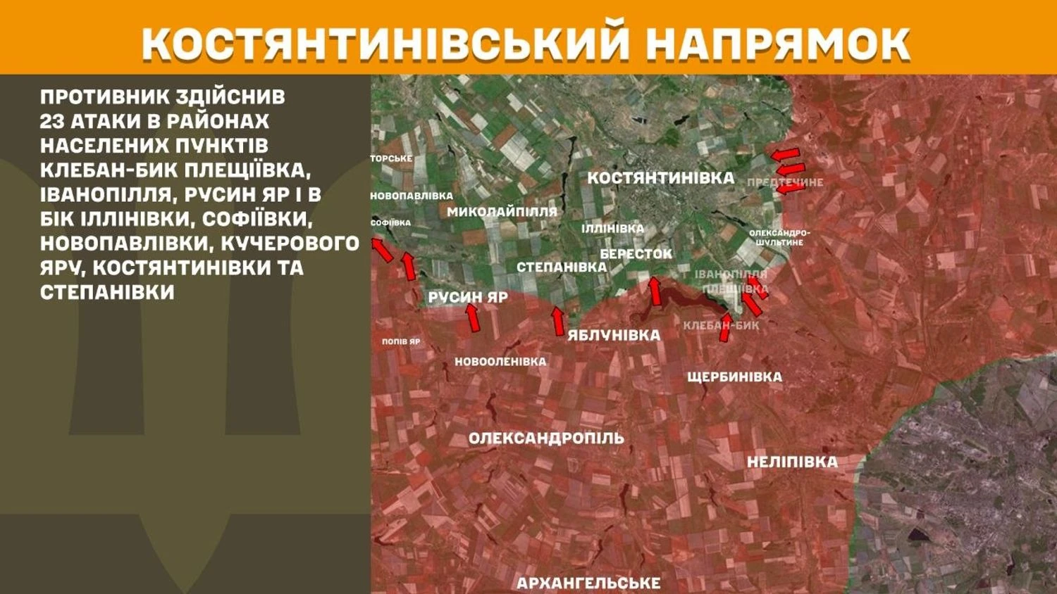 In the Kostiantynivka direction, the enemy carried out 23 attacks in the areas of the settlements of Kleban-Byk, Pleshchiyivka, Ivanopillia, Rusyn Yar and towards Illinivka, Sofiyivka, Novopavlivka, Kucherovo Yar, Kostiantynivka and Stepanivka.