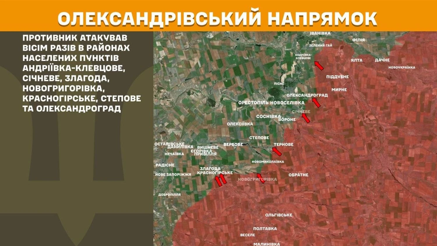 In the Oleksandrivka direction, the enemy attacked eight times in the areas of the settlements of Andriivka-Klevtsove, Sichneve, Zlahoda, Novohryhorivka, Krasnohirske, Stepove and Oleksandrivka.