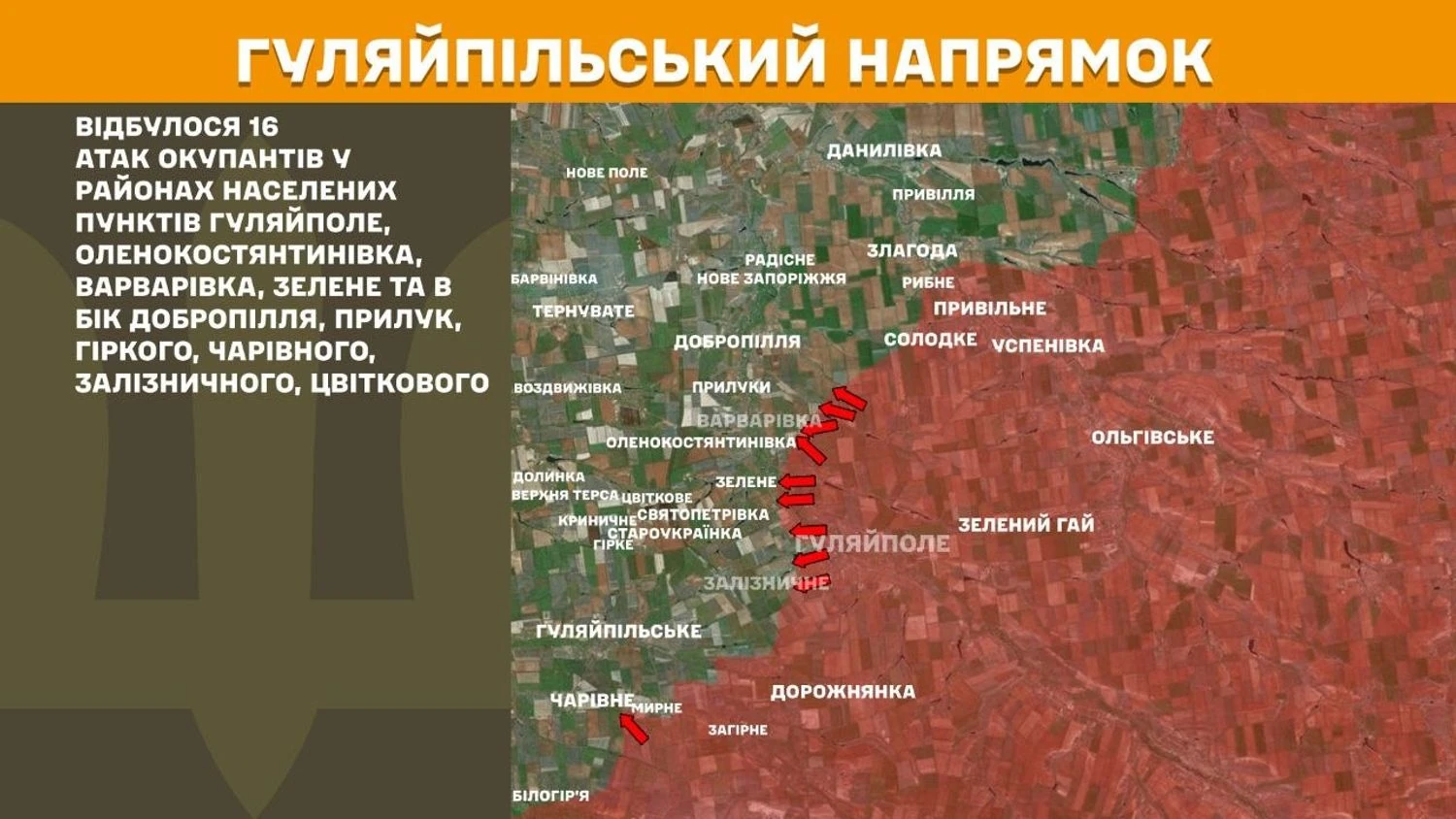 In the Huliaipole direction, there were 16 attacks by the occupiers in the areas of the settlements of Huliaipole, Olenokostiantynivka, Varvarivka, Zelene and towards Dobropillia, Pryluky, Hirke, Charivne, Zaliznychne, Tsvitkove.