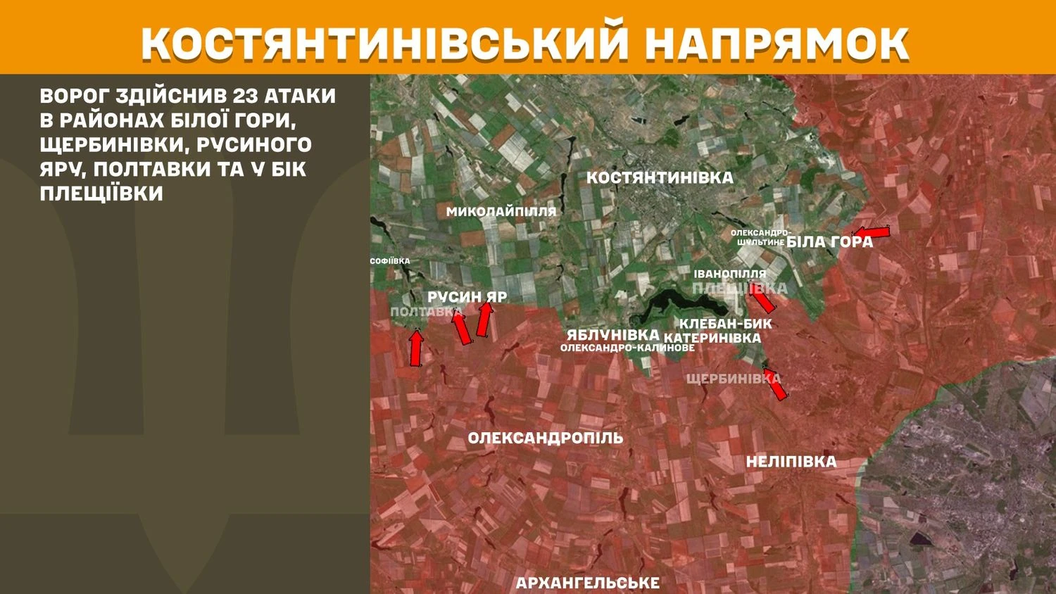 Kostiantynivka - 23 attacks near Bila Hora, Shcherbynivka, Rusyn Yar and Poltavka.