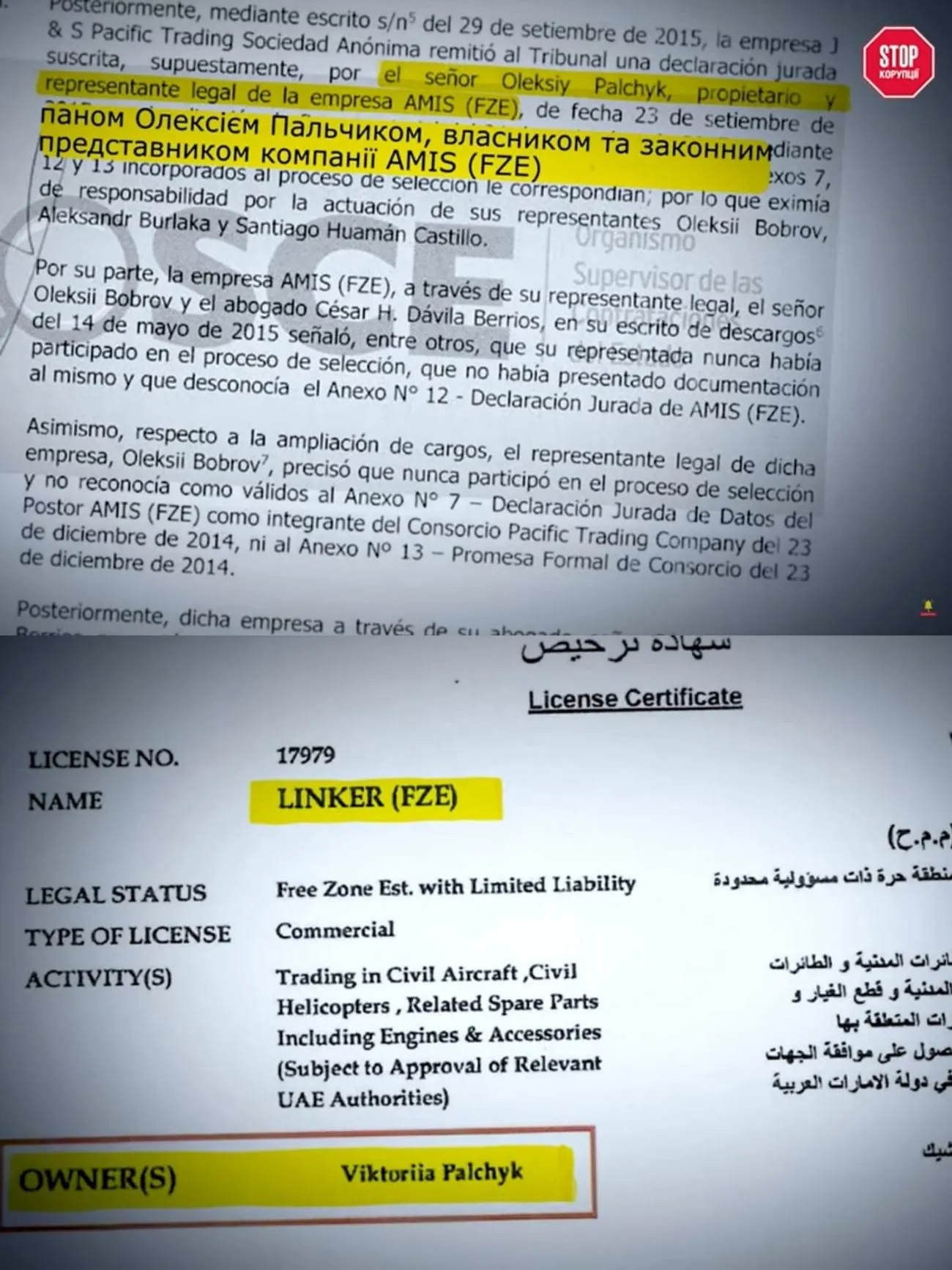 Once again, the owner of the company "LINKER (FZE)" according to the company registration certificate is a citizen of Russia - Palchik V.K. This citizen of the aggressor country is the wife of another citizen of the aggressor country, Palchik O.I. According to a letter from a state body of the Republic of Peru, Palchik O.I. is the owner and legal representative of the company AMIS (FZE).