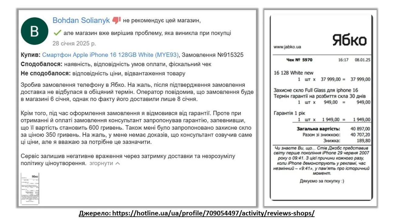 Interestingly, another review on the same platform from user Bohdan Solyanyk about the negative experience of purchasing accessories was accompanied by a photo of a check that, even at first glance, does not correspond to the established sample – it does not contain any details by which it would be possible to carry out verification through official services.
