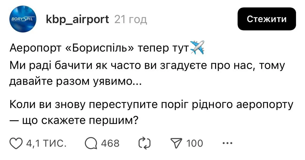 Boryspil International Airport has appeared on the social network Threads. In the first post, the airport team asked Ukrainians what exactly they would say when they crossed the threshold of "Boryspil" again, UNN writes.