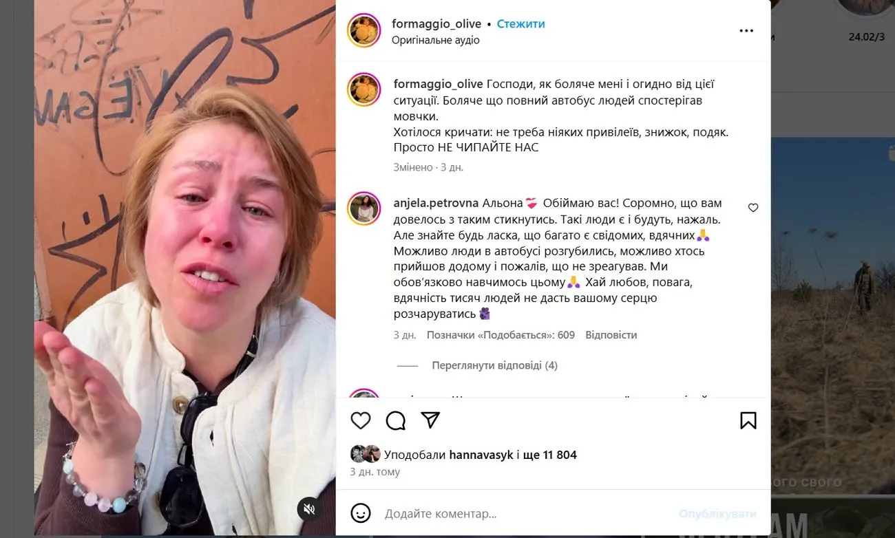 In particular, a few days ago, Olena Lubenska published a video on Instagram, where she said that in one of Lviv's minibuses, she was insulted by a passenger because of her combatant ID.