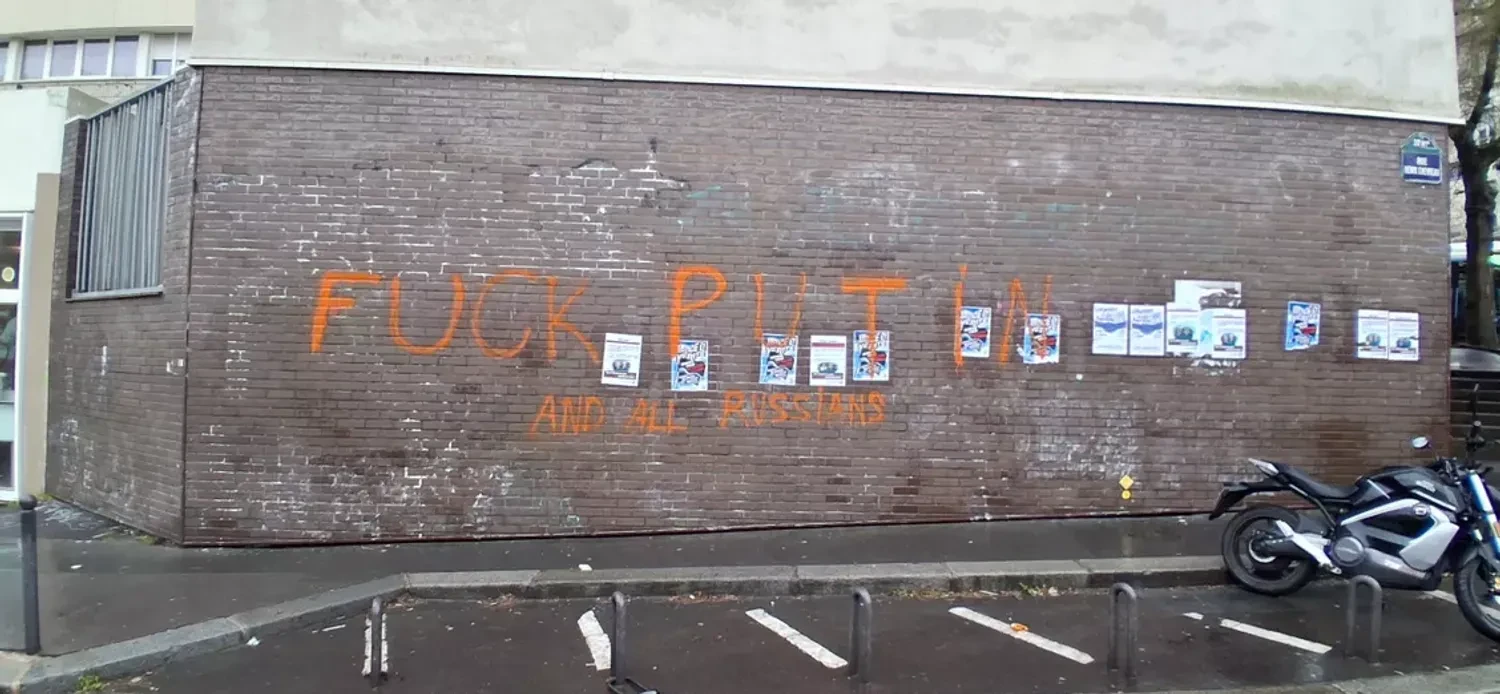 The incident occurred on the night of January 27 in the 20th arrondissement of Paris. Unknown individuals damaged the establishment's windows and spray-painted graffiti in orange paint on the facade and neighboring buildings. Among the inscriptions recorded were anti-Russian slogans "Fuck Putin," "Death to Putin," and "Putin is a killer."