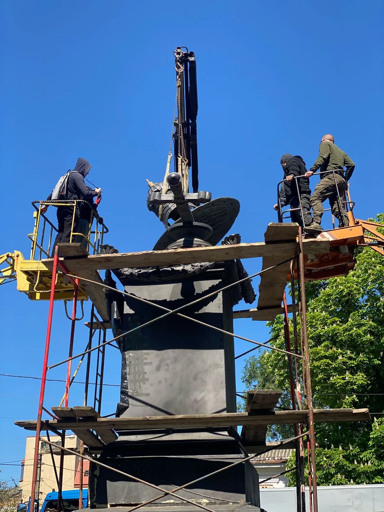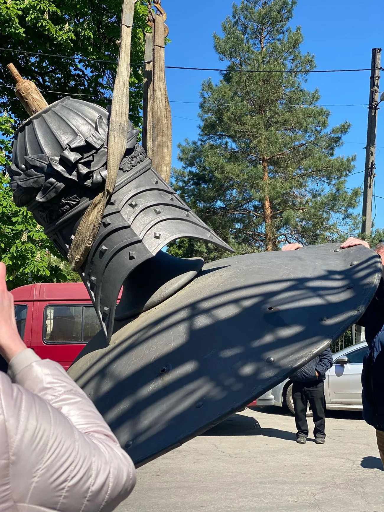 The dismantling workers removed the helmet, shield, sword, figured elements with stylized feathers, and four sculptural garlands. They also dismantled the copper sheets of the pedestal.