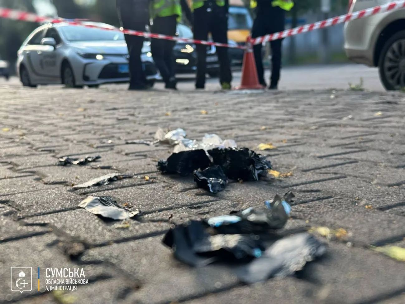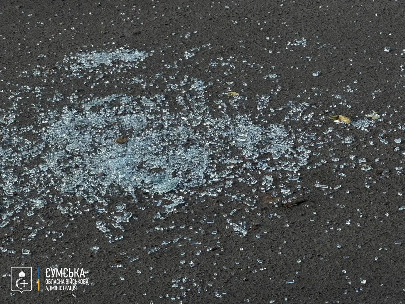 An enemy drone attacked the Sumy community around 6:00 PM, hitting the Kovpakivskyi district. The blast wave damaged the windows of a shuttle bus, several private cars, and a residential building; there are no casualties.