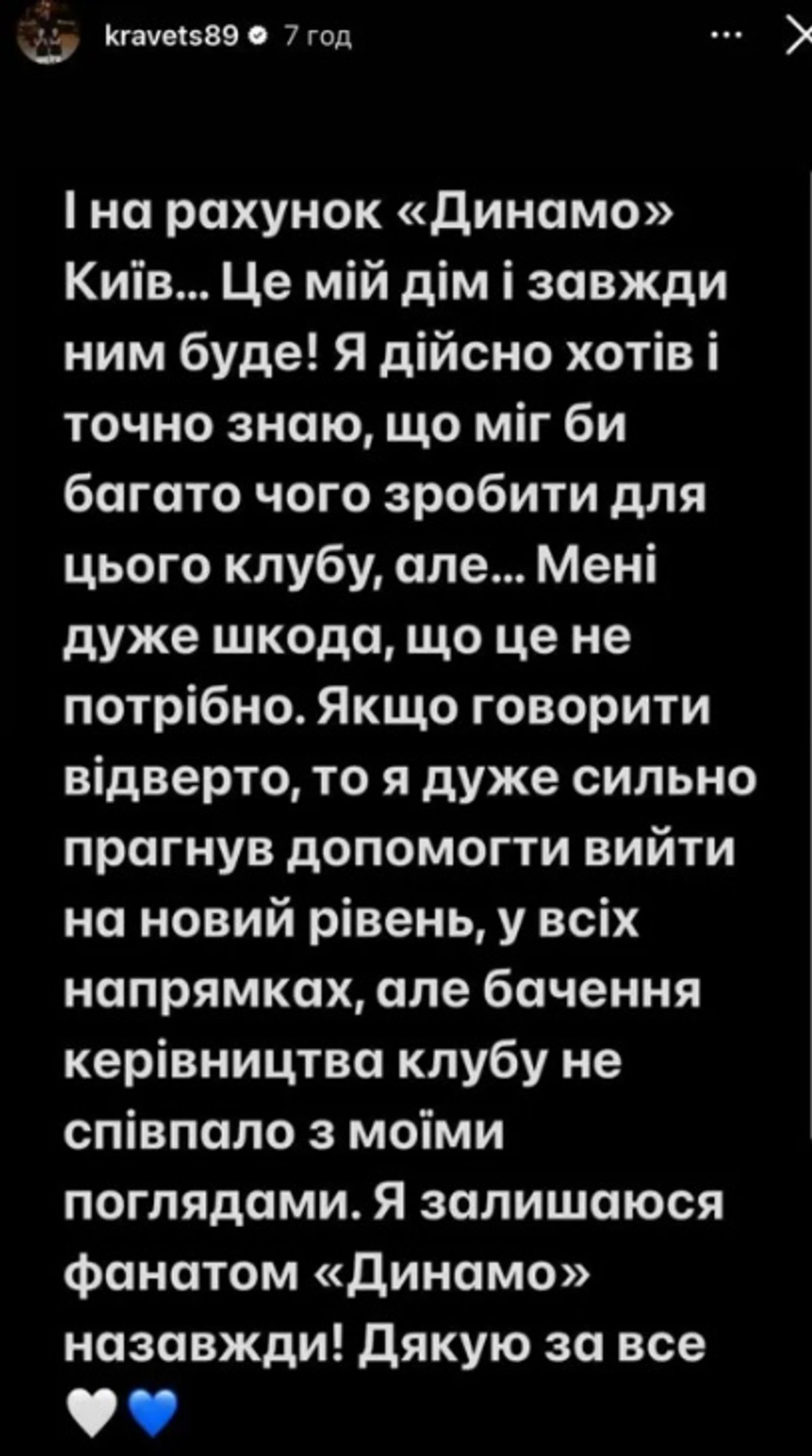 Kravets himself recently announced on Instagram that he had left his position at the capital club, where he was an advisor to the president for the development of youth football.