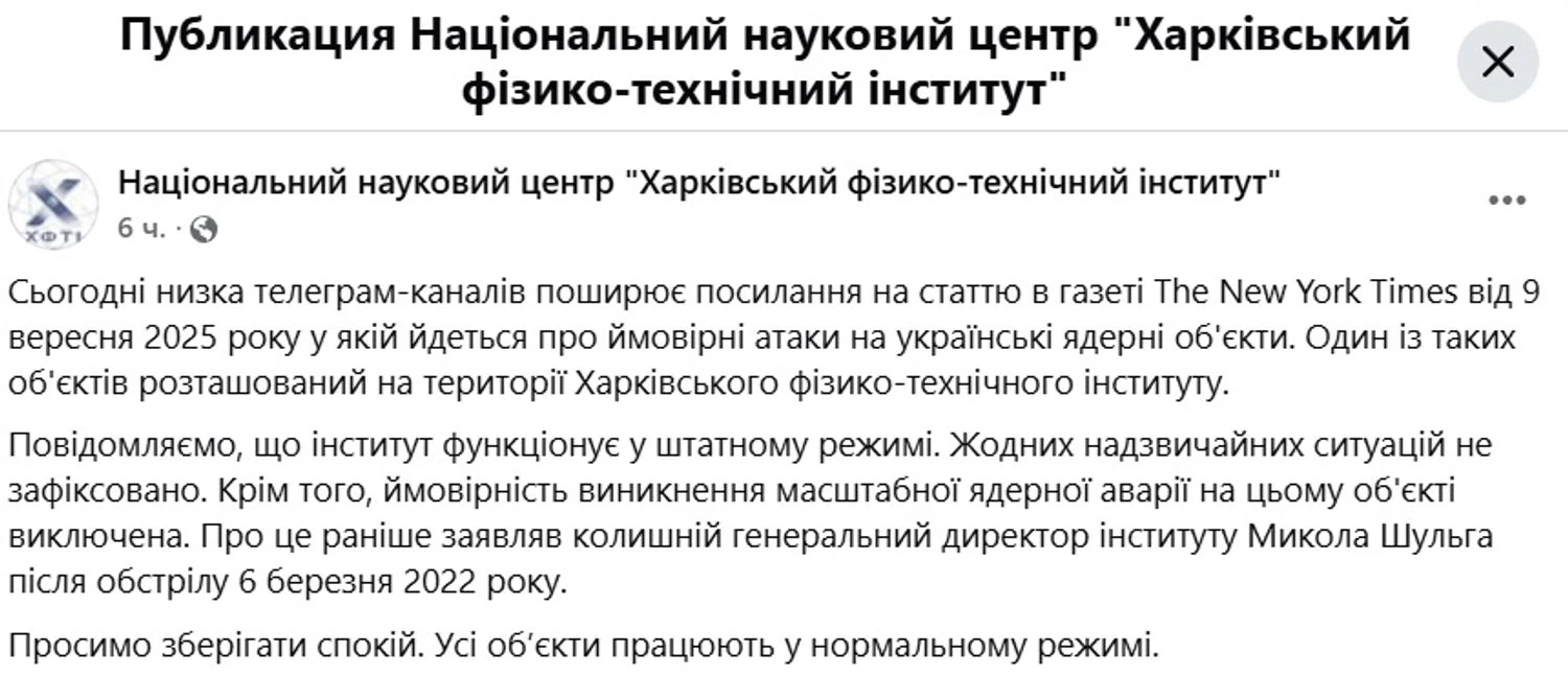 In the statement from the official page of the "Kharkiv Institute of Physics and Technology" center, it is emphasized: