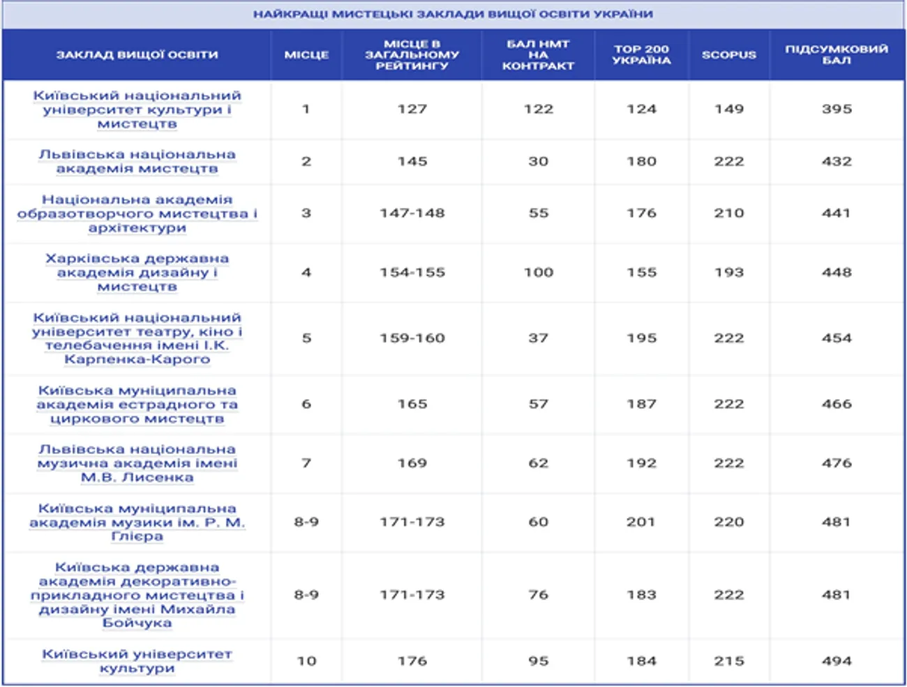 Such systematic work and continuous development confirm that the Kyiv National University of Culture and Arts deservedly holds its leadership in the ranking, providing high-quality, innovative, and practically oriented education for future leaders of Ukraine's cultural and media sphere.