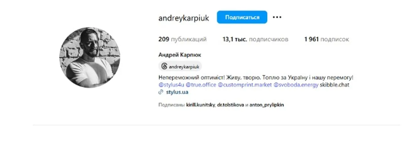 Karpiuk's Instagram page is currently closed to public view. But we still see the telling caption - "Invincible optimist! I live, I create. I'm rooting for Ukraine and our victory."