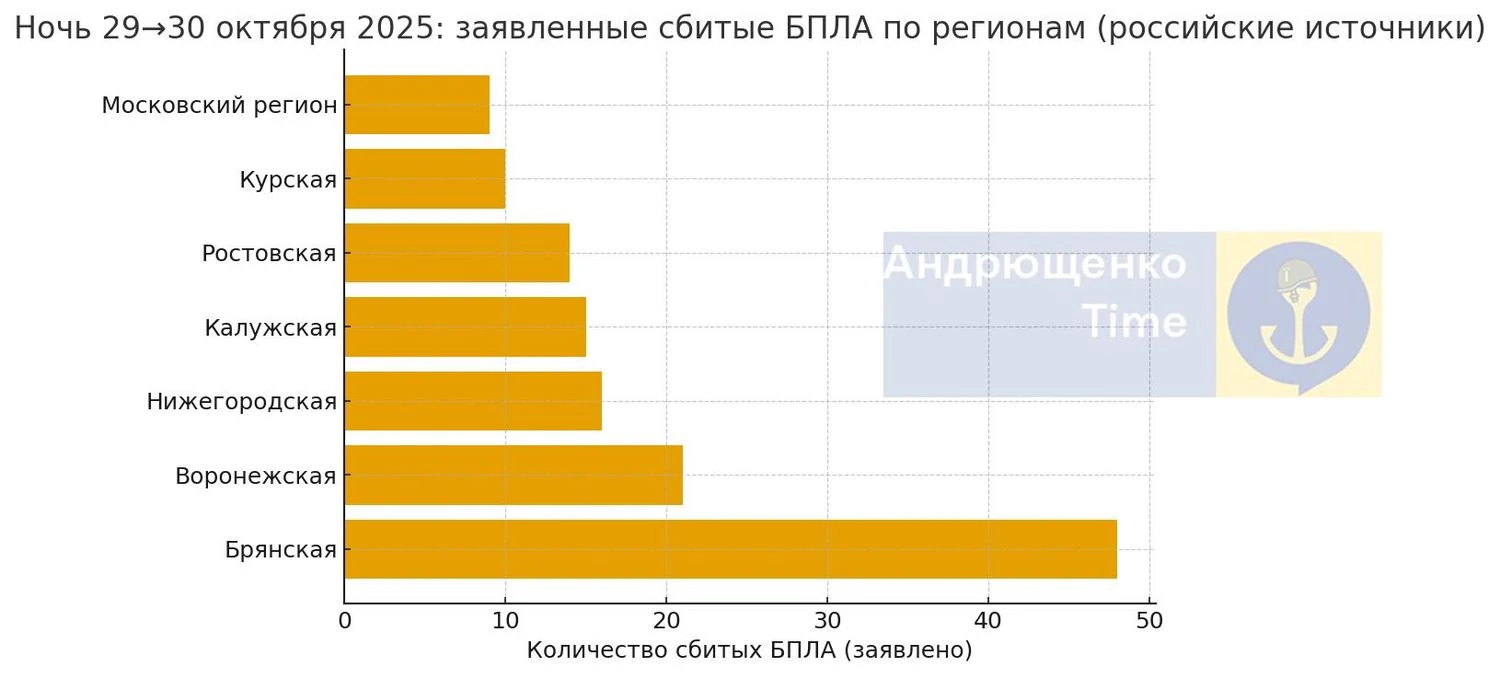 On the night of October 30, a number of Russian regions and occupied Crimea were subjected to a UAV attack. Reports indicate damage to railway infrastructure, a school, and an agricultural enterprise, as well as flight delays in Moscow.