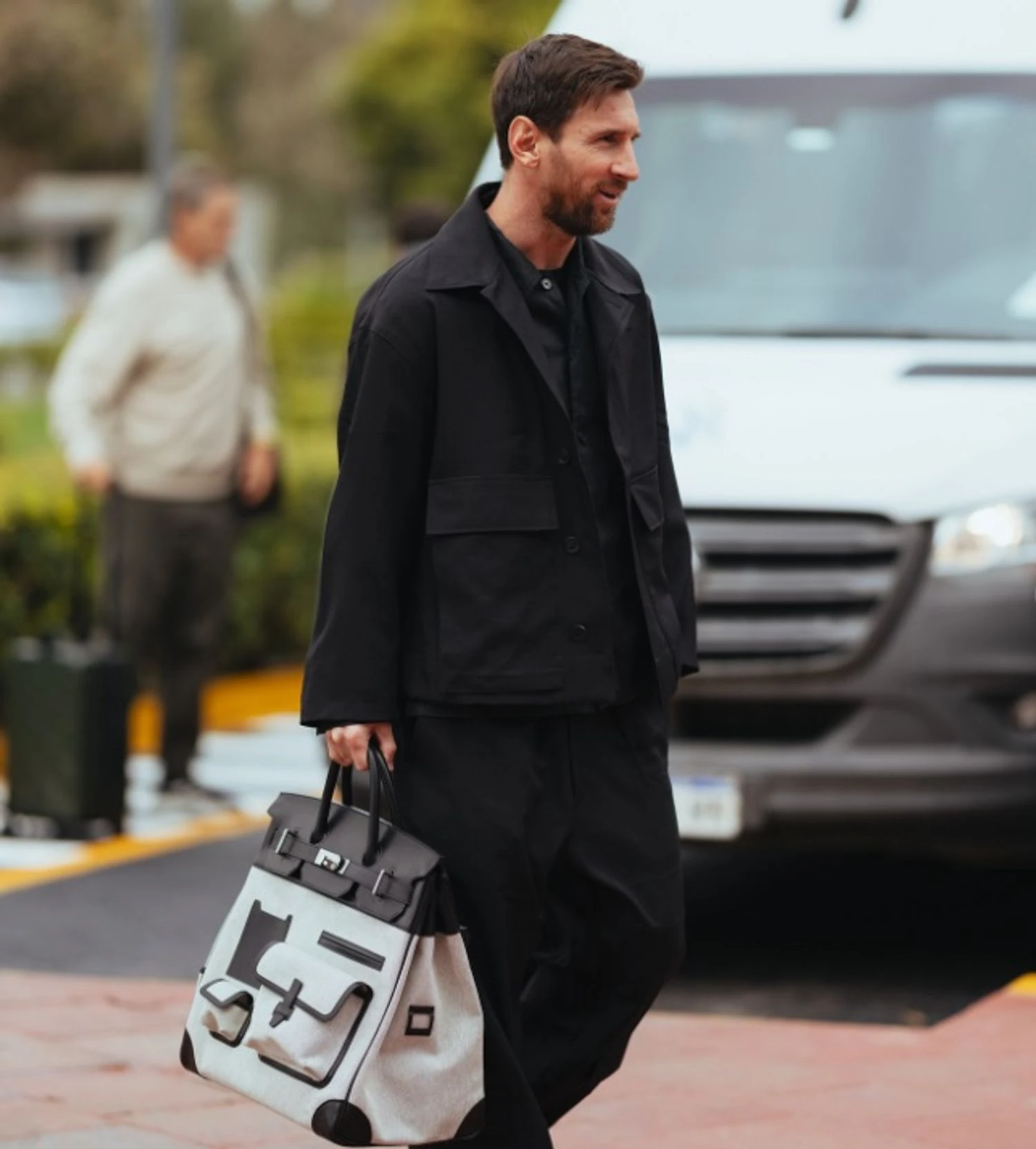 Lionel Messi appeared at the Argentina national team training camp with a Hermès Cargo HAC Birkin 40 Black Box bag worth about $65,000. This is a rare modification of the iconic Birkin made of canvas and leather, featuring practical pockets.