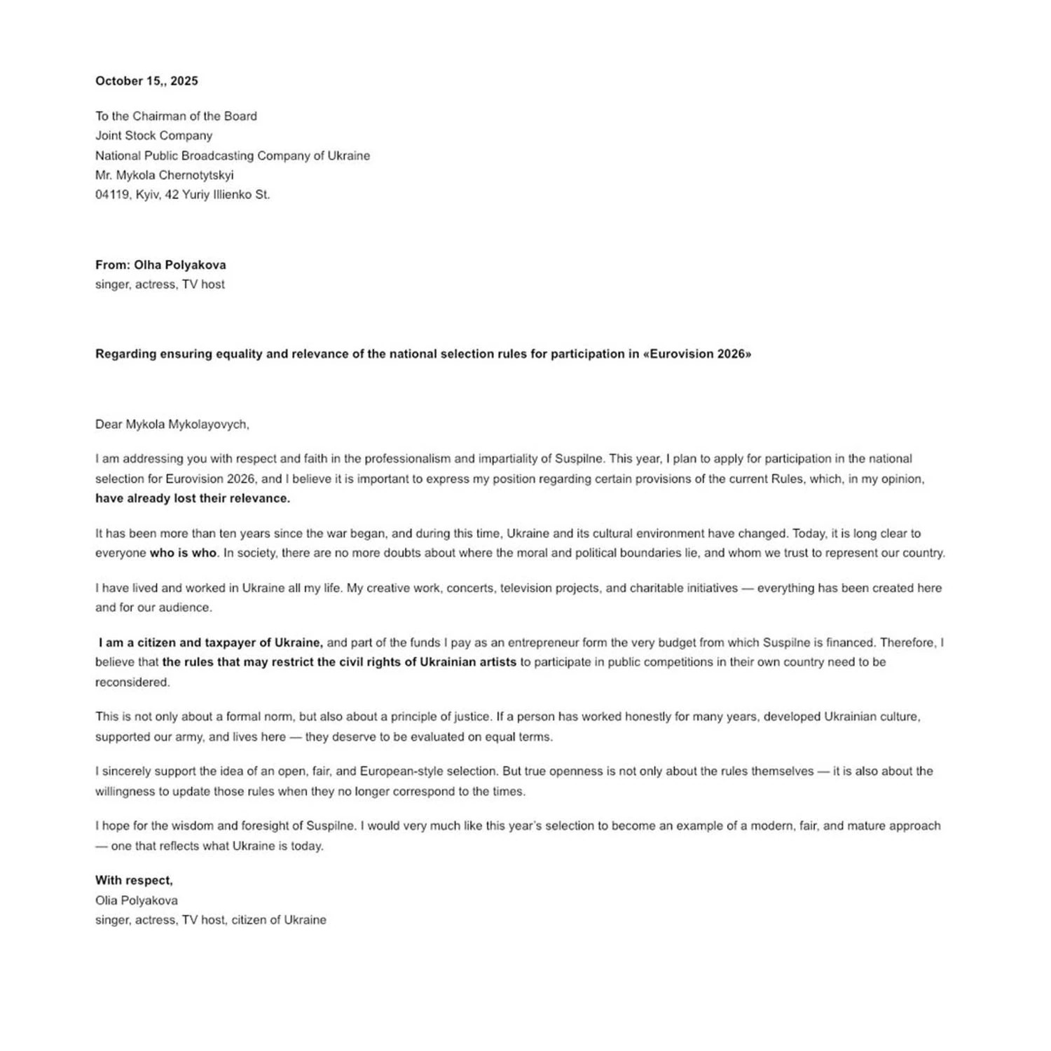Olya Polyakova announced her application for participation in the national selection for "Eurovision 2026" and sent a letter about the need to update certain selection rules. She published the letter she sent to "Suspilne" regarding a fair, modern, and European selection.