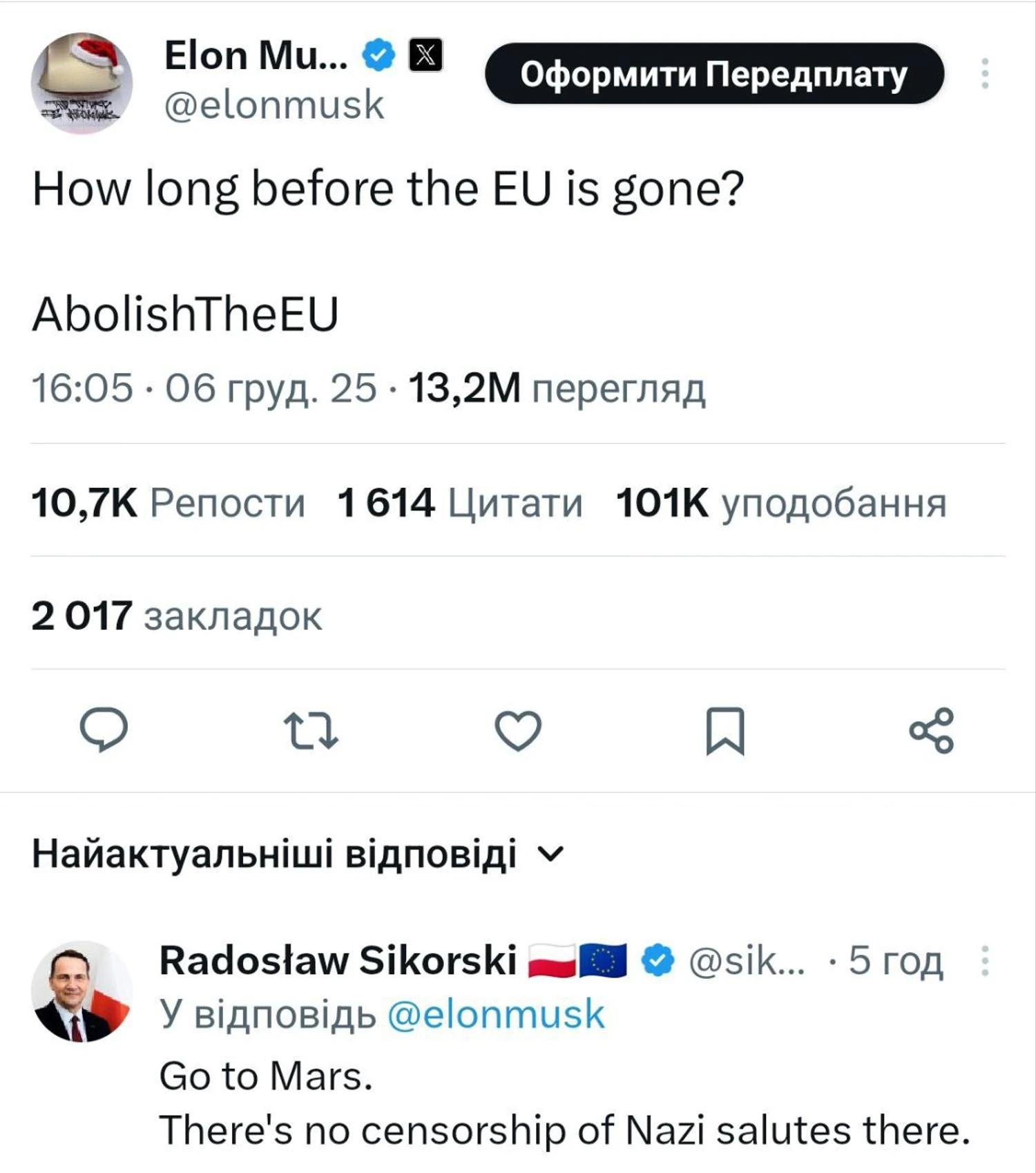 Polish Foreign Minister Radosław Sikorski recommended American entrepreneur Elon Musk to go to Mars after Musk proposed the idea of dissolving the European Union, UNN reports with reference to Musk's post on social network X (Twitter).