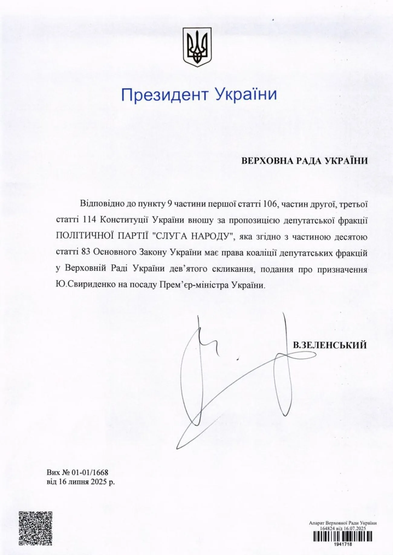 "The President of Ukraine's submission for the appointment of Yulia Svyrydenko as Prime Minister of Ukraine has been received by the Verkhovna Rada. Tomorrow morning, the Committee on State Power Organization will consider it," the People's Deputy's post states.