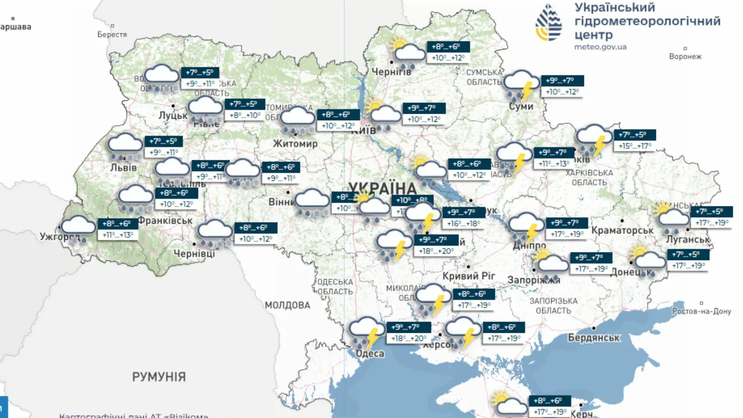 April 26 will be cloudy with clearings, a powerful front will bring rains almost everywhere, wind 15-20 m/s. In the south up to +19°, in the west and north +6…+11°, in Kyiv +10…+12° with possible rain.