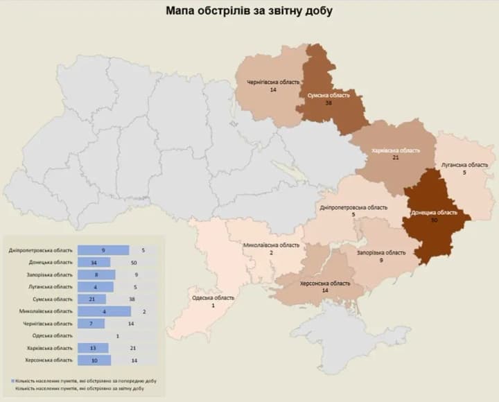 A total of 159 settlements and 94 infrastructure objects were attacked with various types of weapons - mortars, artillery, tanks, MLRS, SAMs, UAVs and tactical aircraft, as stated - "were attacked.