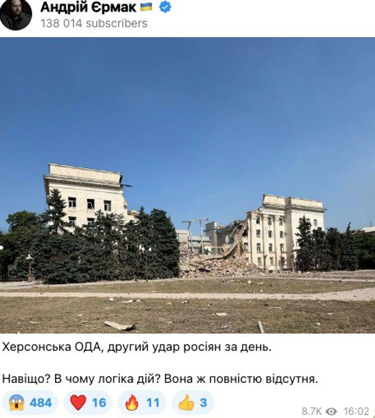 "Kherson Regional State Administration, the second Russian strike of the day. Why? What is the logic of the actions? It is completely absent," - commented the head of the Presidential Office Andriy Yermak on Telegram.