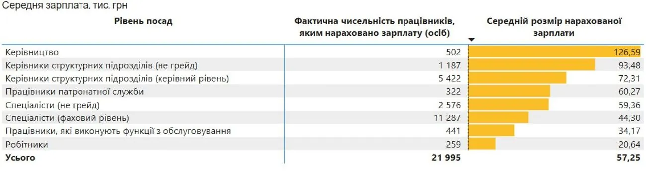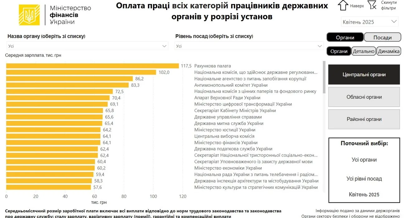 In April 2025, the average salary in government bodies amounted to UAH 57,200, with the highest earners being in the Accounting Chamber, NERC, and NACP. Executives receive an average of UAH 126,600.